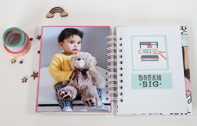 J'ai eu un véritable coup de cœur pour les papiers, qui s'harmonisent parfaitement avec les embellissements, pour réaliser un projet féminin et coloré.